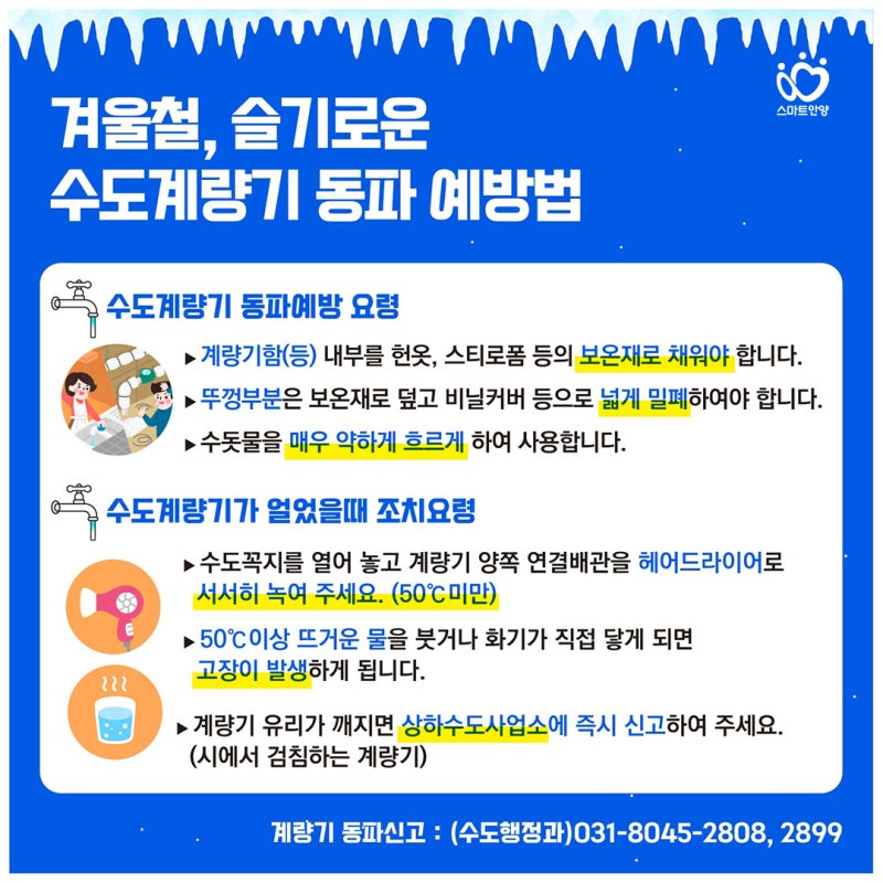 귀하의 집에 물 공급은 겨울을 대비할 준비가 되어 있습니까? 겨울철 수도계량기 동파방지 요령과 급수시설 단열상태도 미리 확인해보세요!