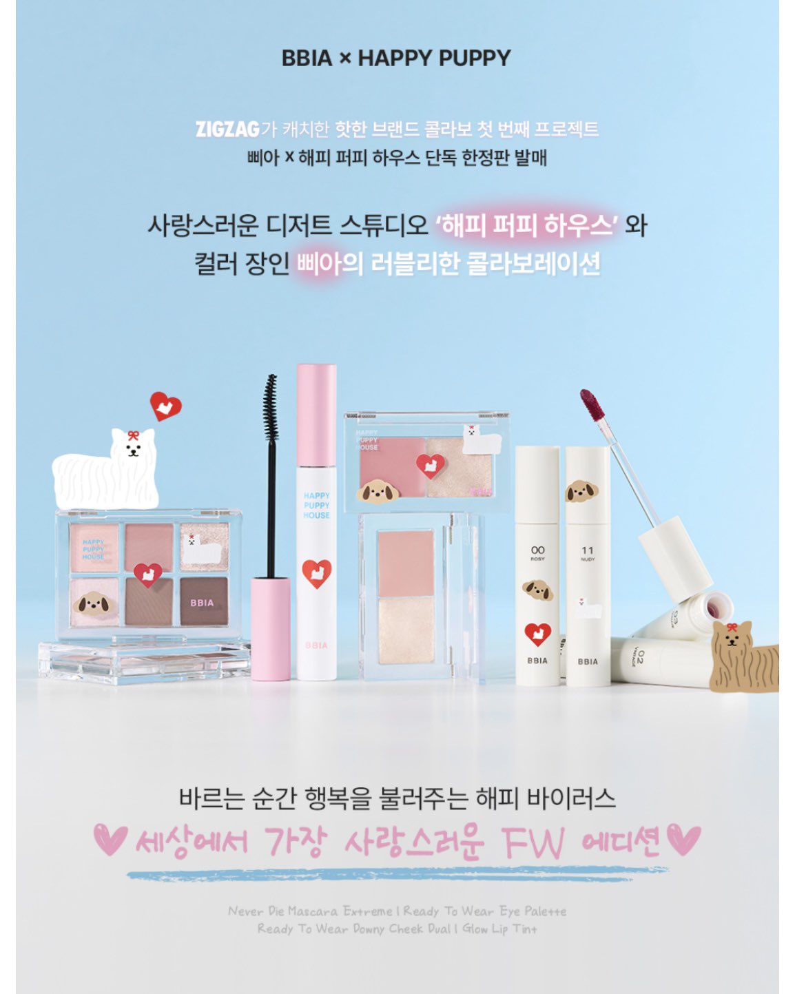 Happy Puppy 에디션입니다! 이번 FW 메이크업 트렌드는 뉴트럴 톤이라고 하는데, 딱 타겟으로 나온 것 같아요. 예전에는 핑크가 화사한 컬러 위주였다면, 지금은 어떤 톤이라도 소화 가능하고 따뜻하고 아련한 느낌이 대세입니다. 너무 귀여운 강아지라서 키우셔야 해요.