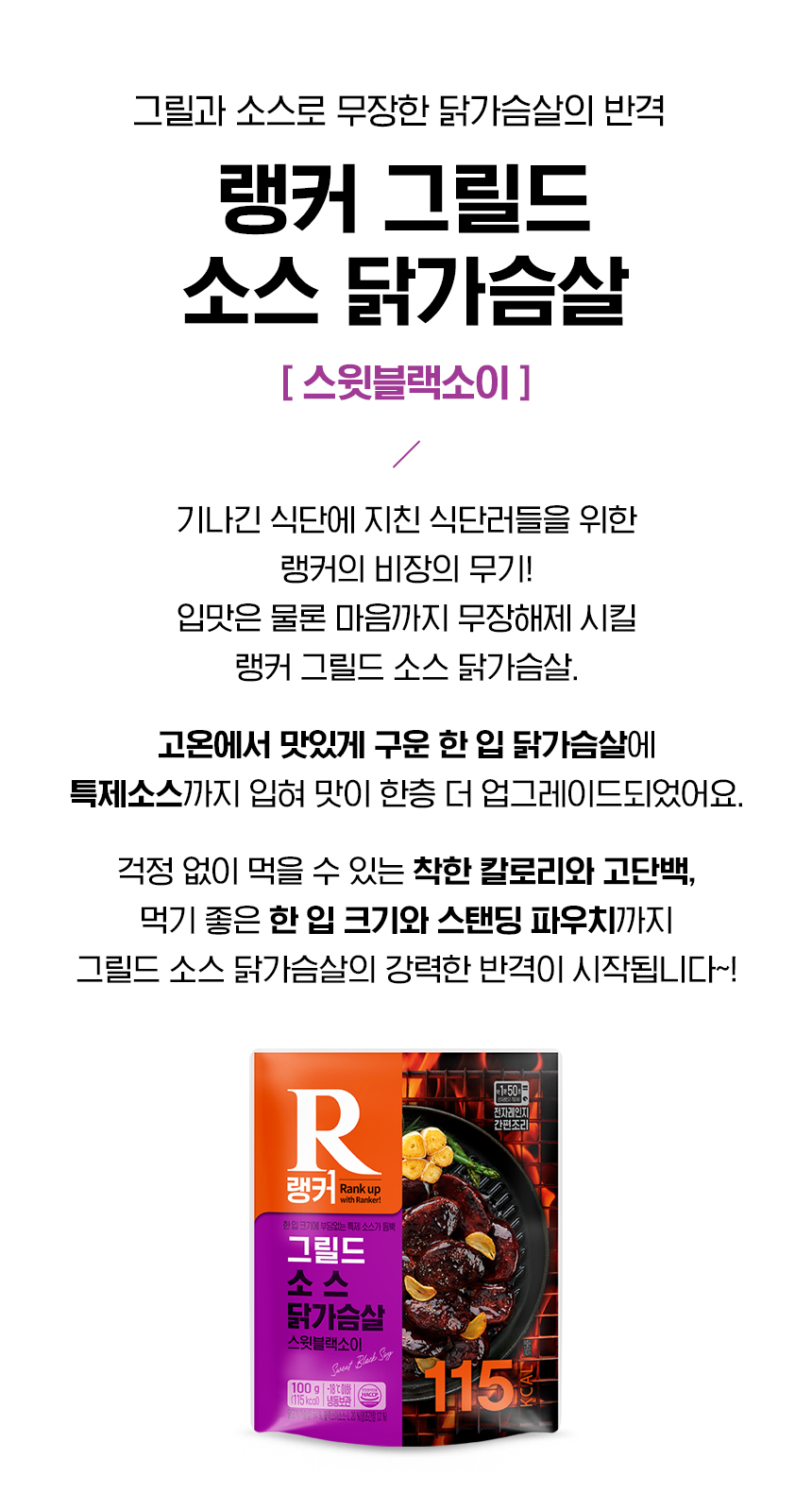 총 3가지 맛으로 나옵니다. 달달한 깐풍, 달달한 흑간장, 달달한 불닭. 이름만 들어도 어떤 느낌인지 알 수 있을 것 같아요. 그릴 오븐에 구워 더욱 쫄깃한 식감을 자랑하며 닭고기, 사슴고기와 잘 어울리며, 랭커 특제 소스가 더해졌습니다. 그리고 별다른 요리나 준비가 필요 없는 심플한 닭가슴살을 사용하여 촉촉하고 쫄깃한 식감과 맛을 선사합니다. 100g 1팩에는 최대 18.7g의 단백질이 함유되어 있으며 이는 일일 단백질 기준치의 최대 34%에 해당합니다. 그리고 칼로리는 115입니다.