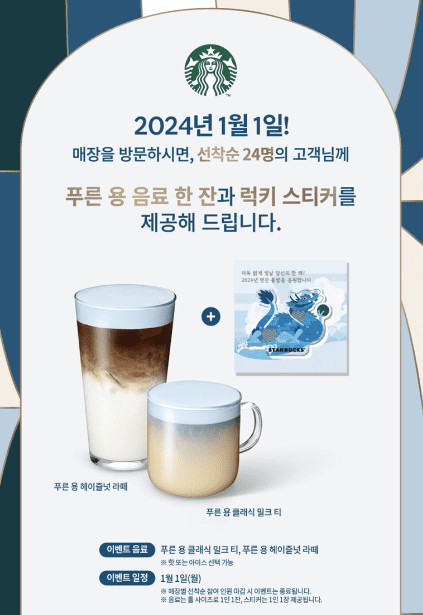 https://thumbnews.nateimg.co.kr/view610///news.nateimg.co.kr/orgImg/kh/2023/12/31/news-p.v1.20231231.a5b1a6e695384a1db04bf34a7df07ceb_P1.jpg● 내용 : 1월 1일(월) 단 하루 동안 선착순 24명 무료 ● 위 음료 1잔 + 럭키 스티커 1개(톨 사이즈 음료 제공) ● 특징 : 사이렌오더, DT존 주문 시 무료 북한강 R 제공 , 여수돌산DT) 스타벅스의 청룡 이벤트 재미있죠? 집 근처 매장을 찾아보니 1월 1일 오전 8시에 오픈했어요! 공휴일에는 오전 8시부터 오픈런을 해야 한다고 해서 오픈런은 아닌 것 같고 10분 정도 소요되는 것 같아요. 일찍 가야 할 것 같아요. 꽤 많은 사람들이있을 것입니다. 오히려 오피스 상업지역에서는 이런 행사가 덜 붐비겠죠. 2. 설날 음료 3종 소개 1) 청룡 클래식 밀크티 T : 6,200원 G : 6,700원 – 특징 : 전통소재 치자나무와 클래식 밀크티를 사용해 청룡의 색을 담은 얼그레이 폼의 부드러운 조합2 ) 청룡 헤이즐넛라떼 T : 6,300원 G : 6,800원 – 특징 : 동일한 얼그레이 폼, 진한 에스프레소와 달콤한 헤이즐넛의 조화 3) 핑크폼 딸기라떼 T : 6,800원 G : 7,300원 – 특징 : 새콤달콤 딸기라떼 푹신한 딸기맛과 핑크폼이 더해져요. 디저트도 4종류? 색상도 예쁘고 너무 귀엽네요! 얼그레이 쉬폰 케이크 블루베리 수플레 케이크 베이컨 크림치즈 씨드 롤 스노우 딸기 생크림 케이크 스타벅스 새해 MD 1월 1일 출시 예정이에요! 각 매장마다 파란색으로 아름답게 진열될 것 같습니다. 설날을 이틀 앞둔 오늘 점심식사를 위해 진관DT점을 방문했습니다! 가능할까 싶었는데 아쉽게도 청룡주에 대한 정보는 아직 없었습니다. 눈 덮인 북한산 풍경을 바라보며 유자민트차를 마시고, 591ml 대용량 오렌지주스&베이컨치즈 토스트를 샀습니다. (선물로 받은 기프티콘을 다 써버렸습니다.) 지금까지 스타벅스 이벤트에 대해 소개해 드렸습니다. 2024년 청룡 설날, 딱 1월 1일 단 하루를 맞이합니다. !선착순 24명에게 블루드래곤 음료 1잔 + 스티커 1개를 증정합니다. 관심있는 이웃님들 모두 성공하시길 바랍니다