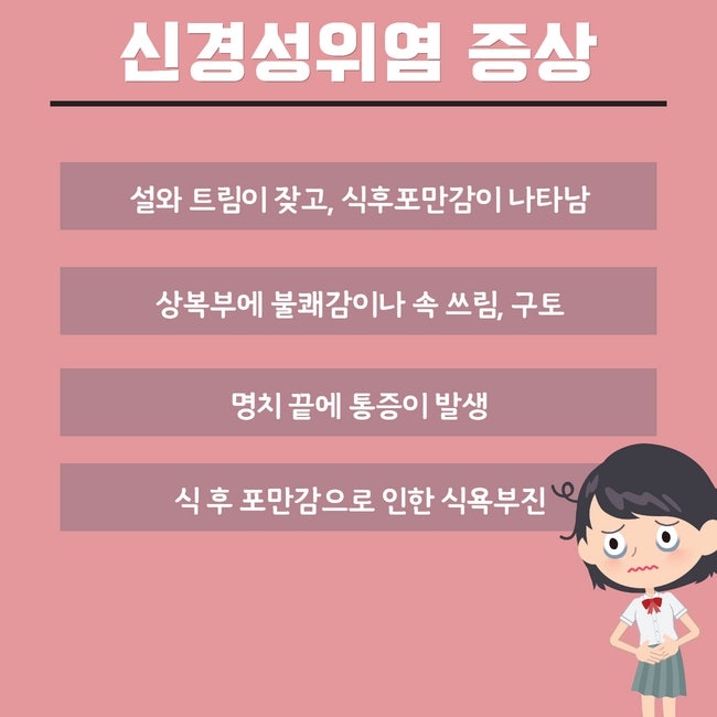신경성 위염은 소화불량 증상이 반복되어 음식 섭취량이 증가하고 삶의 질이 저하된다. 1) 가슴 답답함과 심부전. 2) 더부룩하고 소화불량. 3) 잦은 설사. 4) 빈번한 자만심과 트림.