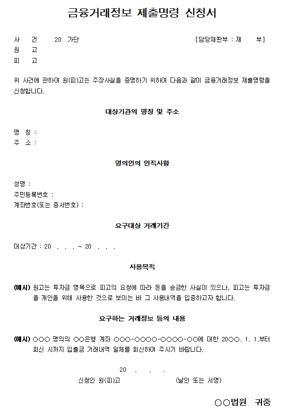 안녕하세요. 황설탕 입니다. 소송을 진행하고자 할 경우 상대방의 이름과 계좌정보만 알고 있는 경우가 있을 수 있습니다. 예를 들어, 은행 송금을 하고 온라인으로 물건을 구매하면 제품이 도착하지 않으며 환불도 되지 않습니다. 이 경우 먼저 소송을 진행함과 동시에 상대방 피고인의 개인정보를 알아보아야 합니다. 이때, 피고인에게 금전을 송금한 이력이 있으므로, 이 정보를 이용하여 피고인의 인적사항을 알아낼 수 있습니다. 이러한 절차를 금융거래 제출명령 신청이라고 합니다. 금융거래 제출명령 신청방법은 아래 포스팅을 참고하시기 바랍니다. 오늘은 본 금융거래 제출명령을 신용협동조합에 신청하였는데, 신용협동조합의 답변을 공유하고자 합니다. 금융거래정보 제출을 위해 채무자의 계좌에서 개인정보를 알아냅니다. 금융거래정보 제출을 위해 채무자의 계좌에서 개인정보를 알아냅니다. 안녕하세요. 황설탕 입니다. 자소송을 할 때… blog.naver.com 신용협동조합에 서류 제출 명령을 신청합니다. 상대방으로의 이체내역을 보면 은행명이 신용협동조합은행으로 기재되어 있고, 신용협동조합이 대상기관으로 기재되어 있으며, 우리가 알고 있는 상대방의 이름과 계좌번호가 포함된 문서가 기재되어 있었습니다. 법원에 제출 명령 신청서를 제출했습니다. 이때 네이버에서 신용협동조합을 검색했더니 신용협동조합 홈페이지가 나오더니 주소는 신용협동조합 주소였습니다. 이후 법원은 제출명령 사본을 신용협동조합 은행에 송달했고, 신용협동조합은 이를 접수했다. 중앙협회에서는 다음과 같은 답변을 보냈습니다. 위 답변에는 신용협동조합중앙회와 신용협동조합협회가 별도의 독립법인으로 설립되었기 때문에 관련 정보를 보유하고 있는 특정 매장이나 부서에 문의하라는 내용이었습니다. 답변이 없는지 궁금했는데, 결국 조사대상자(피고인)의 지점이 어느 신용조합이 개설되어 있는지 알려주셨습니다. 피고인이 어느 신용조합 지점을 이용하고 있는지까지 알아냈습니다. 소송에서 승소한 뒤에도 이 계좌를 계속 사용할 것으로 판단되면 이 신용협동조합을 압류할 수도 있겠다는 생각이 들었습니다. 물론, 사용중인 계좌가 변경될 가능성이 높습니다… 다시 한번 금융거래 제출명령 신청서를 제출합니다. 신용협동조합에서 피고인 신용협동조합 지점을 통보하였으므로 이 답변을 첨부합니다. 금융거래 제출명령 신청서를 다시 한번 제출하였습니다. 당연히 이 경우 대상기관은 위 답변에 표시된 신용협동조합이었고, 주소도 신용협동조합 홈페이지에서 확인됐다. 며칠 뒤 신용협동조합으로부터 답변을 받아 피고인의 성명과 주민등록번호, 주소를 확보했다. 당사자 신고 정정 신청서를 제출한 피고인의 개인정보를 확보하였으므로, 당사자 신고 정정 신청을 하여야 합니다. 아래와 같이 정정요청을 제출하였습니다. (정정전) 피고인 김개동 (정정후) 피고인 김개동 (881122-1234567) 00구 00로 000동 000호 (00동, 00아파트) 이후, 법원은 위 주소로 피고인에게 고소장/소송장 사본을 보냈습니다. 당사자 표기/응답요약 수정 안내/신청서를 보내드렸습니다. 위와 같은 과정을 거친 후 조금 검색을 해보니 새마을도 위와 동일하다는 것을 알게 되었습니다. 새마을중앙회에 금융거래 제출명령을 신청하면 새마을중앙회에서 문의자의 지부를 알려준다는 기사를 봤습니다. 따라서 신용협동조합, 새마을 등으로부터 금융거래 제출명령을 신청하는 경우에는 이 점을 참고하시기 바랍니다.