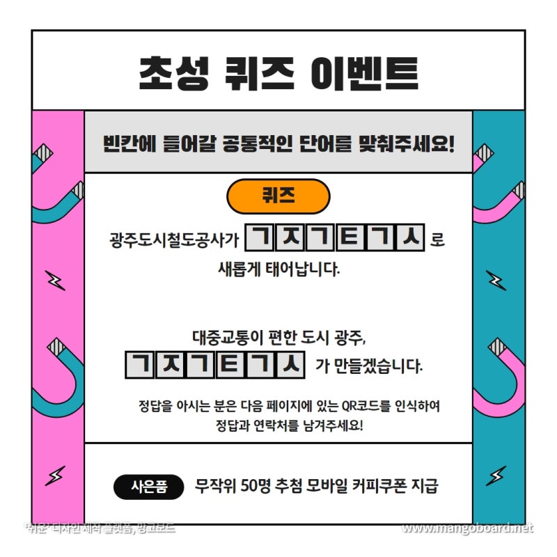 맙소사! 벌써 12월이네요. 우리 학생들은 한 해를 잘 마무리하고 있나요? 2023년이 한 달밖에 남지 않았지만, 한편으로는 아직 한 달이나 남았네요! 1월초에 다짐했던 일들을 되돌아보며 2023년을 멋지게 마무리해볼까요~~ 12월의 문을 열면서 싱가에서 뜻깊은 이벤트를 진행합니다. 나는 그것을 가져왔다. 싱친이시라면 우리 광주교통공사가 ‘인권경영’을 실천하고 있다는 사실을 잘 알고 계실텐데요. 오늘은 세계인권선언 75주년을 기념하는 광주교통공사의 ‘인권경영선언’과 ‘세계인권선언’입니다. 알아보실 수 있도록 퀴즈 이벤트를 준비했습니다. (아~교육퀴위즈!!) 한가지 더! 지금 상무역에서는 인권사진전이 매일 열리고 있어요. 국가인권위원회 광주인권사무소와 국제앰네스티 한국지부가 공동으로 주최하는 특별전시회입니다. 세계인권선언문 30개조를 아름다운 그림과 함께 안내해 드립니다. ‘인권’에 대해 생각해 볼 수 있는 특별한 기회! 아이들과 손을 잡고 인권교육을 받으러 오셔도 좋습니다. 출근길에, 시장에 가거나, 데이트하러 오기에도 좋아요. 광주에서 꼭 가볼만한 곳으로 추천합니다. 일상생활 속에서 누구나 편안하게 접근할 수 있습니다. 광주도시철도에서 ‘인권’을 직접 경험해보세요. 자! 지금부터 퀴즈 안내입니다! 씽가 힌트 찾는 방법~ 밑에 비밀글로 적어놨어요~ 이제 겁먹지 말고 도전해보세요! 도전하시는 분께 선물을 드립니다! 행사명 : 광주교통공사 인권경영 알아보기 퀴즈 이벤트 참여기간 : ‘23.12.1(금) ~ 12.10(일) 참여방법 – 하단 링크를 통해 공사 홈페이지 ‘설문조사’ 섹션에 접속해 풀기 퀴즈 참여 혜택 : 무작위로 40명을 추첨하여 모바일 상품권을 받을 수 있는 설문조사 이벤트 참여 링크입니다. 모바일(스마트폰)로 접속하시는 분은 아래 링크를 클릭해주세요! 광주교통공사 모바일(grtc.co.kr) PC로 접속하시는 분은 여기를 클릭하세요! https: //www.grtc.co.kr/subway/poll/list.do?rbsIdx=57Sokdakdakdak… 어떤 힌트?? 광주교통공사의 ‘인권경영선언’과 ~~’세계인권선언’을 보실 수 있습니다~ (세계인권선언문 : https://amnesty.or.kr/resource/%EC%84%B8) %EA%B3%84%EC%9D%B8%EA%B6%8C%EC%84%A0%EC%96%B8)세계인권선언일이 1948년 12월 10일이다… 참 다행이다 기억하신다면… 흠… * 친구 추가, 댓글, 좋아요는 행운의 상징입니다!