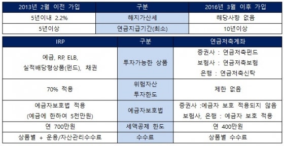 1. 만기 후 수령 만기 후 연금을 수령하면 기타 소득세 16.5% 대신 연금소득세 3.3~5.5%만 납부하면 되기 때문에 만기 후에도 절세 혜택을 누릴 수 있습니다.2. 특별한 사유 없이 조기 탈퇴가 불가능합니다. 다만, 무주택자의 주택구입 및 전세보증금, 친족의 질병이나 부상으로 인한 6개월 이상의 요양, 개인회생, 파산절차, 천재지변 등 뚜렷한 사유가 있는 경우에는 조기인출이 가능합니다. 3. 계좌해지 IRP 퇴직연금 계좌를 폐쇄하면 높은 세율의 소득세와 그동안 받았던 세액공제 혜택을 모두 납부해야 합니다.