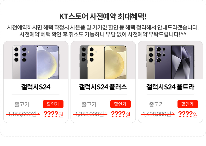 ▲ 생성 AI 기술을 이용해 촬영한 사진을 손쉽게 편집할 수 있다. 이전에는 전문적인 사진 편집 프로그램을 통해 가능했던 기술을 이제 Galaxy를 통해 쉽게 편집할 수 있습니다. 이 밖에도 문서 요약, 검색 기능 등 다양한 분야에서 AI를 활용할 수 있다. ▲ 온디바이스 AI가 가져올 새로운 변화에 개인적으로 큰 기대가 되고 있다. 많은 관심을 끌었던 카메라에도 사용되고 있습니다. 어두운 곳에서 촬영한 사진에도 AI를 적용해 노이즈와 흔들림, 흐릿함을 줄여주는 ‘나이트그래피(Nightography)’ 기술이 적용됐다. 또한, 일반 영상촬영에서 부족한 프레임을 인공지능이 채워주기 때문에 슬로우모션 영상을 실행할 때도 매우 부드럽습니다. 부드러운 움직임을 보여줍니다. ▲ 카메라 사양을 확인해보면 울트라 모델은 광각 2억(F1.7), 초광각(F2.2) 1,200만, 5배 망원(F3.4) 5,000만, 1,000만 화소를 갖췄다. 3x 망원(F2.4) 카메라. 플러스와 일반 모델에는 광각(F1.8) 5천만개, 초광각(F2.2) 1천200만개, 3배 망원(F2.4) 1천만개가 탑재됐다. ▲ 이전 모델의 카메라 사양은 훌륭했지만, 갤럭시 S24는 온디바이스 AI를 통해 더 좋은 결과를 낼 수 있었고, S23 시리즈에 비해 베젤은 더 얇고 배터리 용량은 더 커졌다. 삼성은 온디바이스 AI로 변화했다. KT의 갤럭시S24 시리즈 사전예약과 제공되는 혜택도 함께 확인해보자. 사전예약 이벤트 ▲ 출시일과 배송일을 확인해보자. KT 사전예약 후 배송 및 개봉이 진행됩니다. 사전 예약 기간은 2024년 1월 19일(금) 0시부터 2024년 1월 25일(목)까지이며, 배송 및 오픈은 1월 26일(금)부터 시작된다. ▲ KT.com 단독 혜택으로 구매 시 울트라 1TB는 512GB 가격으로 제공되기 때문에 사양이 높은 모델을 찾는다면 고려해 볼 만할 수도 있다. 또한 울트라 512GB는 256GB 가격으로 제공되며, 레귤러와 플러스 모델의 512GB도 256GB 가격으로 제공된다. 제공되는 혜택을 받으실 수 있습니다. ▲ 요고(요즘 통신걱정 마세요)는 KT.com에서만 가입할 수 있는 직거래 요금제예요. 요고(Yogo)를 통해 사전등록을 하시면 다양한 혜택이 여러분을 기다립니다. Yogo 69 요금제를 주문한 고객에게 인기 기기인 Galaxy Tab A8과 Buds 2 Pro를 모두 제공하고 있습니다. ▲ 최신 스마트폰을 할부로 구매한다면 수수료도 무시할 수 없다. 요고 가입 혜택으로 24개월 무이자 할부로 최대 11만원을 절약할 수 있습니다. 기존 중고폰에 대한 추가 20만원 보상 등의 혜택도 누릴 수 있어 초기 구입비용 부담을 줄일 수 있다. ▲ 요고 요금제 사전등록 고객에게 네이버페이 3만원을 선착순 증정한다. 요고 오픈 후 ‘마들’ 이벤트를 신청하시는 고객분들도 선착순 500명에게 제공되는 혜택에 참여하실 수 있습니다. 추첨행사에서는 오픈고객 200명을 추첨해 드립니다. 이에 금화 1개, S펜, 케이스티파이 케이스, 무선충전기 등 인기 사은품이 랜덤으로 배송된다. 자세한 내용은 포스팅 하단의 홈페이지 링크를 참고해주세요. ▲ 갤럭시매니아 VIP 혜택에는 마니아로 확정된 선착순 500명에게 삼성 모바일 포토프린터와 배달의 민족 3만원 쿠폰 등이 포함된다. (2월 6일부터 순차적 배송) ▲ KT.com 단독 이벤트 삼성 인기 제품을 추첨을 통해 증정하며, 갤럭시스토어 3만원 상품권과 PD충전기, JBL TOUR PRO2를 증정하는 이벤트도 진행 중이다. 인터넷+TV 동시구매시 당첨자는 2월 6일 화요일에 발표됩니다. 자세한 내용은 공식 홈페이지를 참고해주세요. ▲ 개통 고객 전원에게 케이스, 충전대 등 전용 액세서리 구매 시 3만원 쿠폰과 최대 21만원 상당의 KT닷컴 쿠폰팩을 증정한다. 전용 액세서리 쿠폰은 활성화 후 다음날 15시에 발송되며, 쿠폰팩은 활성화한 달 이내에 배송됩니다. 표준요금 납부 다음달부터 매월 5일 활성화된 전화번호로 발송됩니다. ▲ 앞서 언급했듯이 제조사가 제공하는 혜택으로 KT 단독으로 저장용량을 512GB에서 1TB 모델로, 256GB에서 512GB 모델로 업그레이드할 수 있다. 삼성 케어 플러스나 버즈2 프로+ 인기 케이스 구매권 중 99,000원. 당신은 선택을 할 수 있습니다. 버즈2 프로를 이용하면 온디바이스 AI를 통해 실시간 통역 기능을 더욱 편리하게 사용할 수 있어 더욱 유용할 것 같아요. ▲ 이강인의 아시안컵 활약은 눈부시다. KT 고객이라면 3월 축구대표팀 A경기 티켓 240장(1인 2장)과 이강인 선수단의 사인 유니폼을 10명에게 증정하는 이벤트도 함께 진행된다. 포스팅에서 설명하지 못한 내용이 많으니 갤럭시 S24 시리즈를 구매해 보세요. 고민하고 계시다면 아래 링크를 통해 풍성한 혜택을 누려보시기 바랍니다. 특별전시 | KT 공식 온라인몰 KT ShopGalaxy S24 사전예약 abit.ly